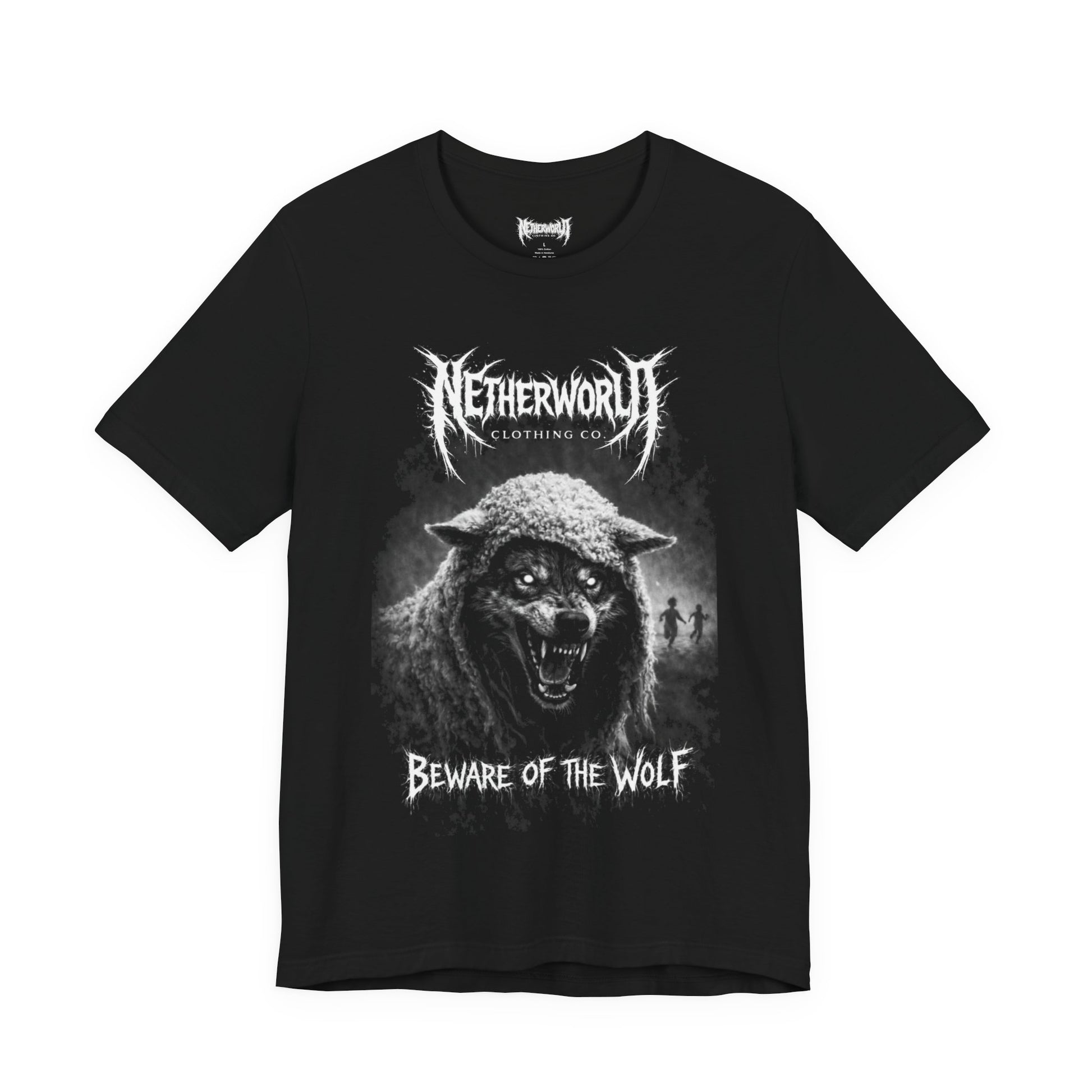 Lightweight cotton, heavy intent. A wolf in sheeps stares you down, etched in brutal strokes and branded with “Beware of the Wolf” — symbol of the ancient warning: trust appearances at your own risk